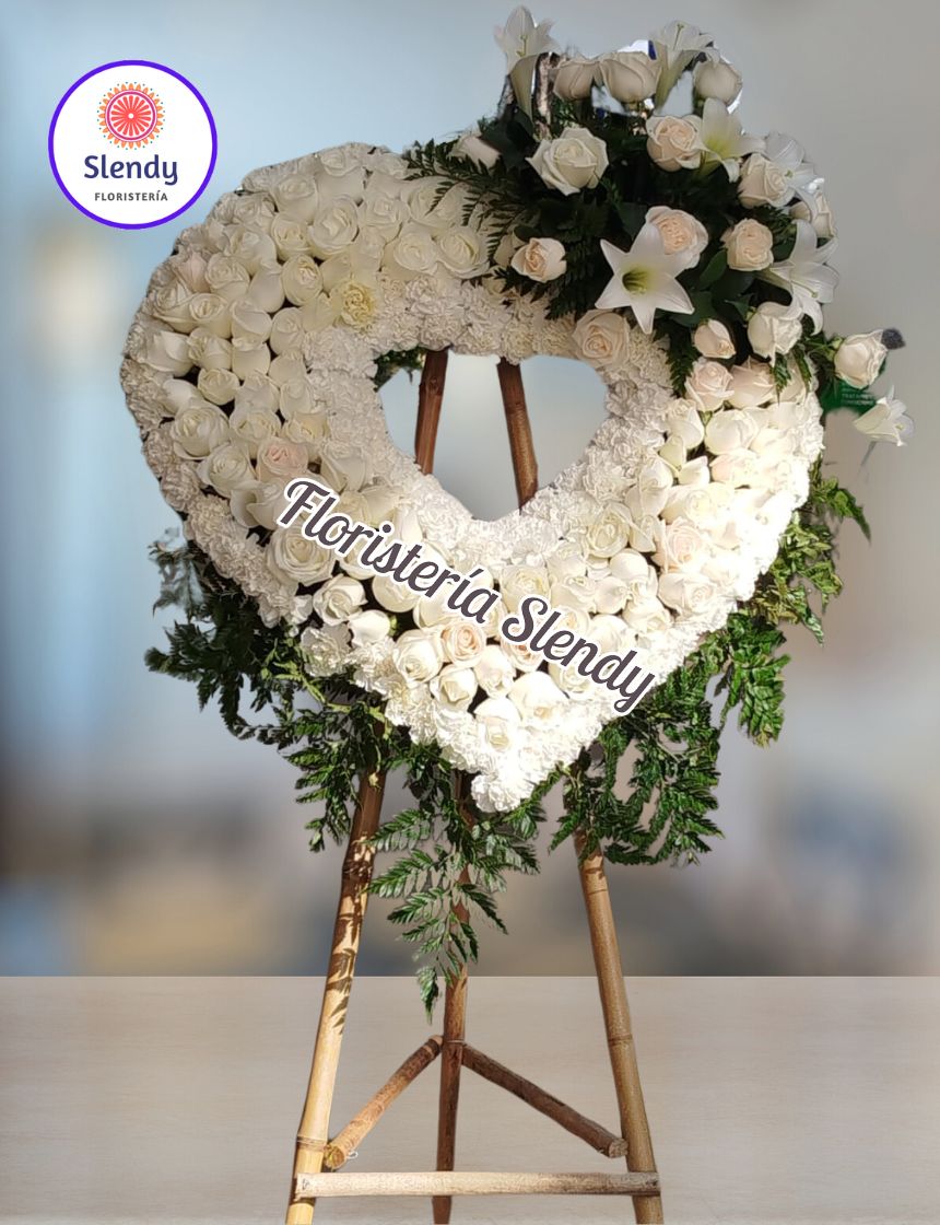 Arreglo fúnebre en flores blancas y verdes follajes.